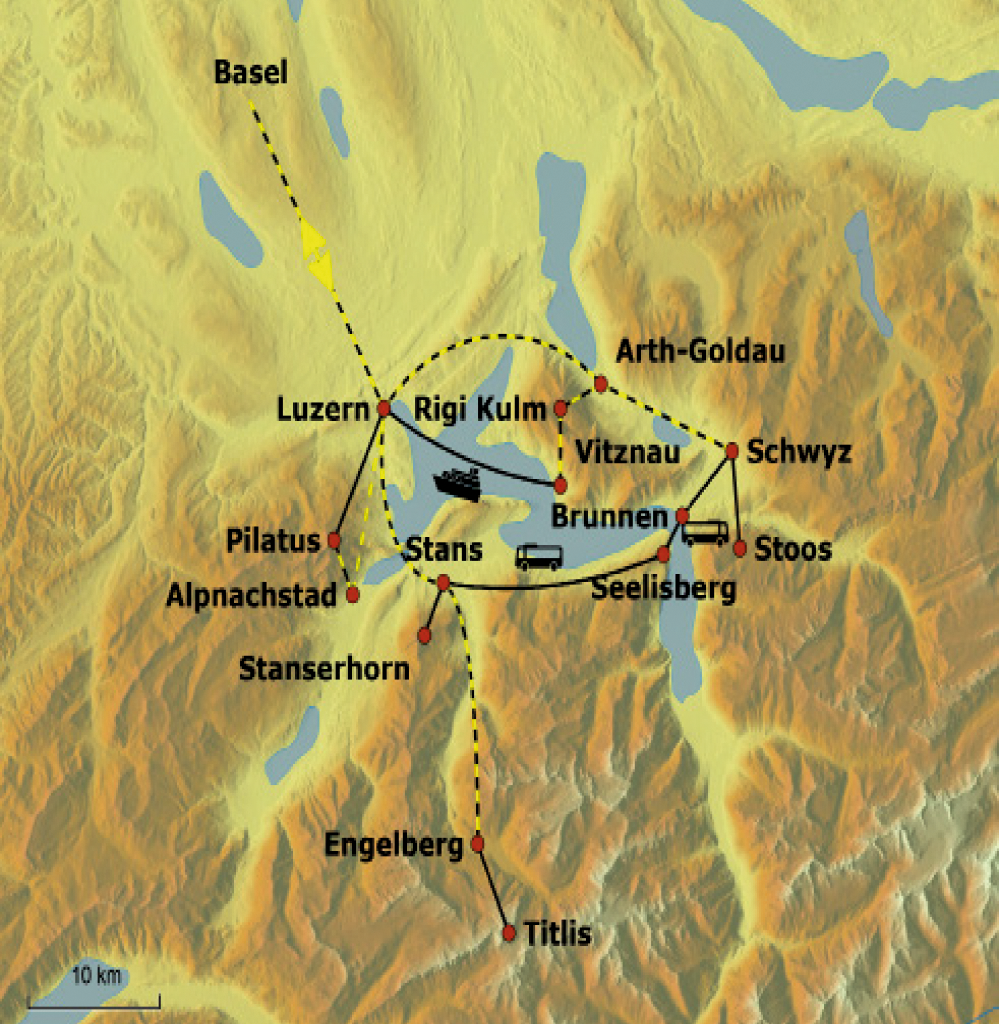 Mit der Bahn und einer kurzen Busfahrt erreichen wir die Talstation der Stoosbahnen. Die Standseilbahn Schwyz – Stoos und die Luftseilbahn Morschach – Stoos erschließen das autofreie Bergdorf Stoos – und das gleich mit einem Weltrekord! Die Standseilbahn von Schwyz nach Stoos ist die steilste der Welt. Ein technisches Wunderwerk, das bereits die Anreise zum Erlebnis macht. Angekommen auf dem Stoos eröffnet sich uns ein traumhaftes Bergpanorama. Talwärts geht es nach Morschach und mit dem Bus nach Brunnen am Vierwaldstättersee. Eine kurze Seeüberquerung mit dem Schiff bringt uns nach Treib. Mit der Treib-Seelisberg-Bahn, einer elektrischen Standseilbahn, erreichen wir das Bergdorf Seelisberg. Bekanntester Ortsteil der Gemeinde ist sicherlich das Rütli gemäß mythischer Überlieferung die Gründung der Schweiz stattfand. Luzern erreichen wir am Nachmittag per Bus und Schmalspurbahn ab Stans. Der Abend in Luzern steht zur freien Verfügung.