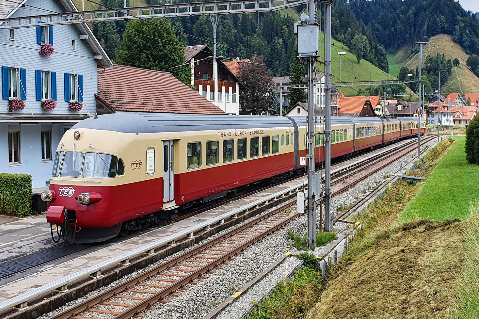 Dreitägige exklusive 1.Klasse-Charterfahrt im Trans-Europa-Express RAe1053 der SBB Historic von Basel auf unterschiedlichen Strecken der Nordschweiz via Gotthard-Bergstrecke nach Lugano am gleichnamigen See und zurück inklusive 2x Mittagsmenü im TEE.
