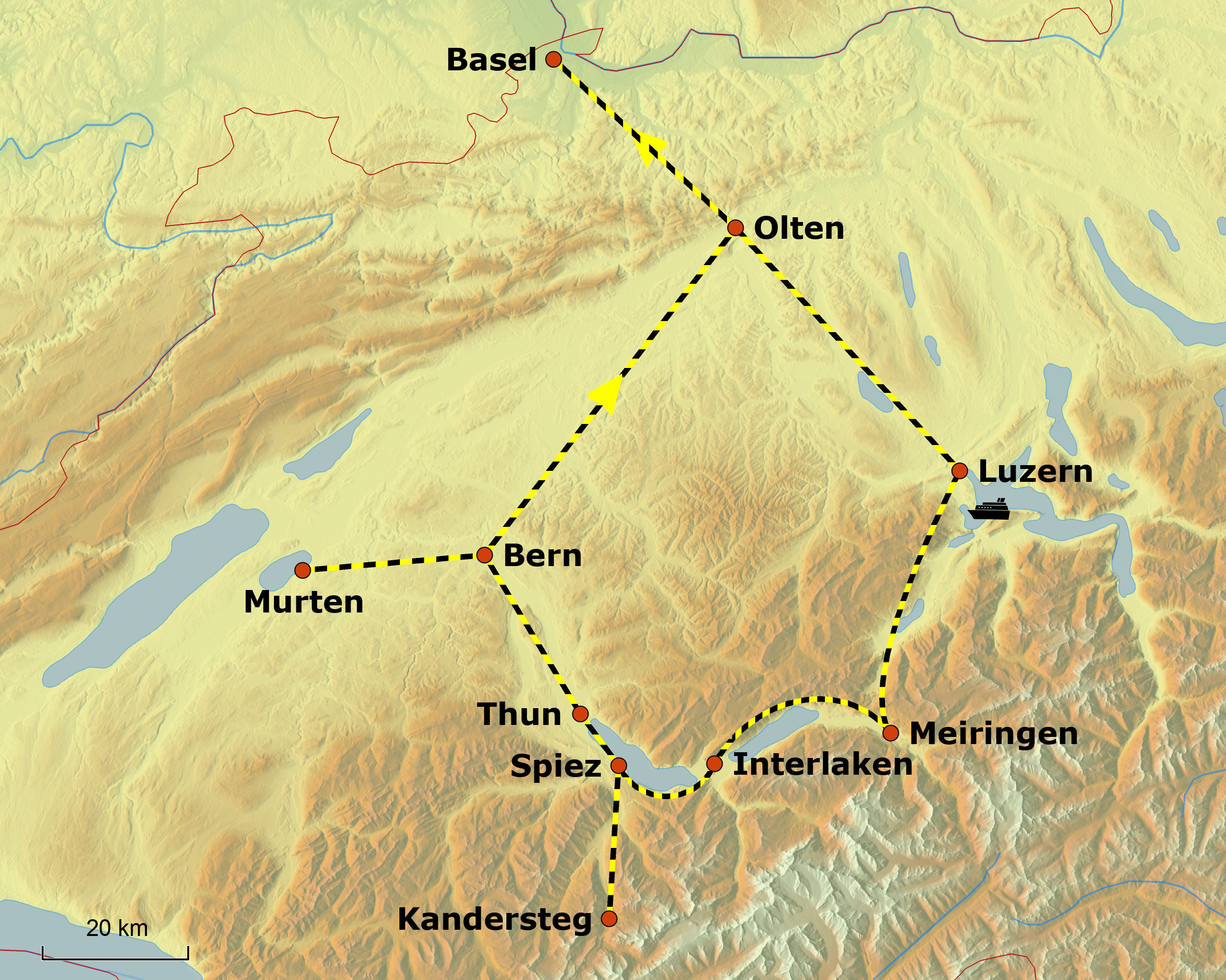 - 4x Übernachtung im Hotel mit Unterbringung im DZ mit Dusche oder Bad und WC (1x Murten, 2x Kandersteg, 1x Luzern)